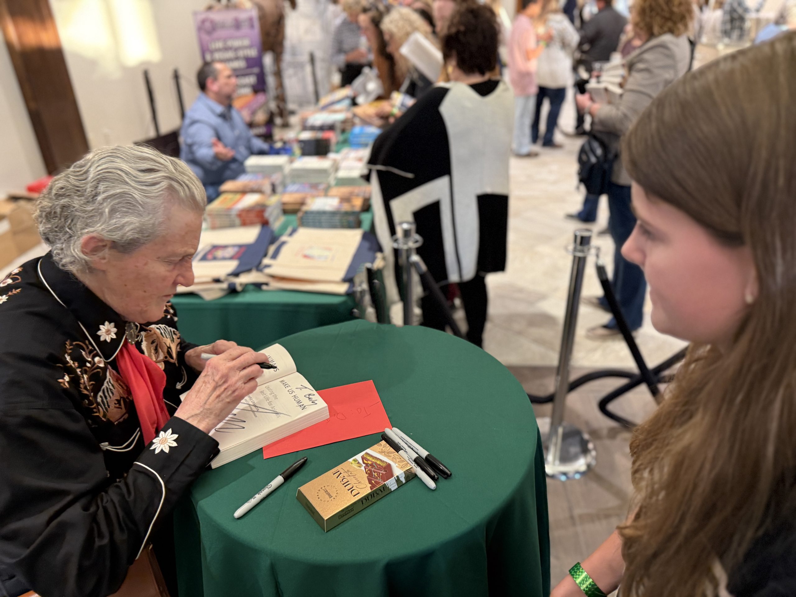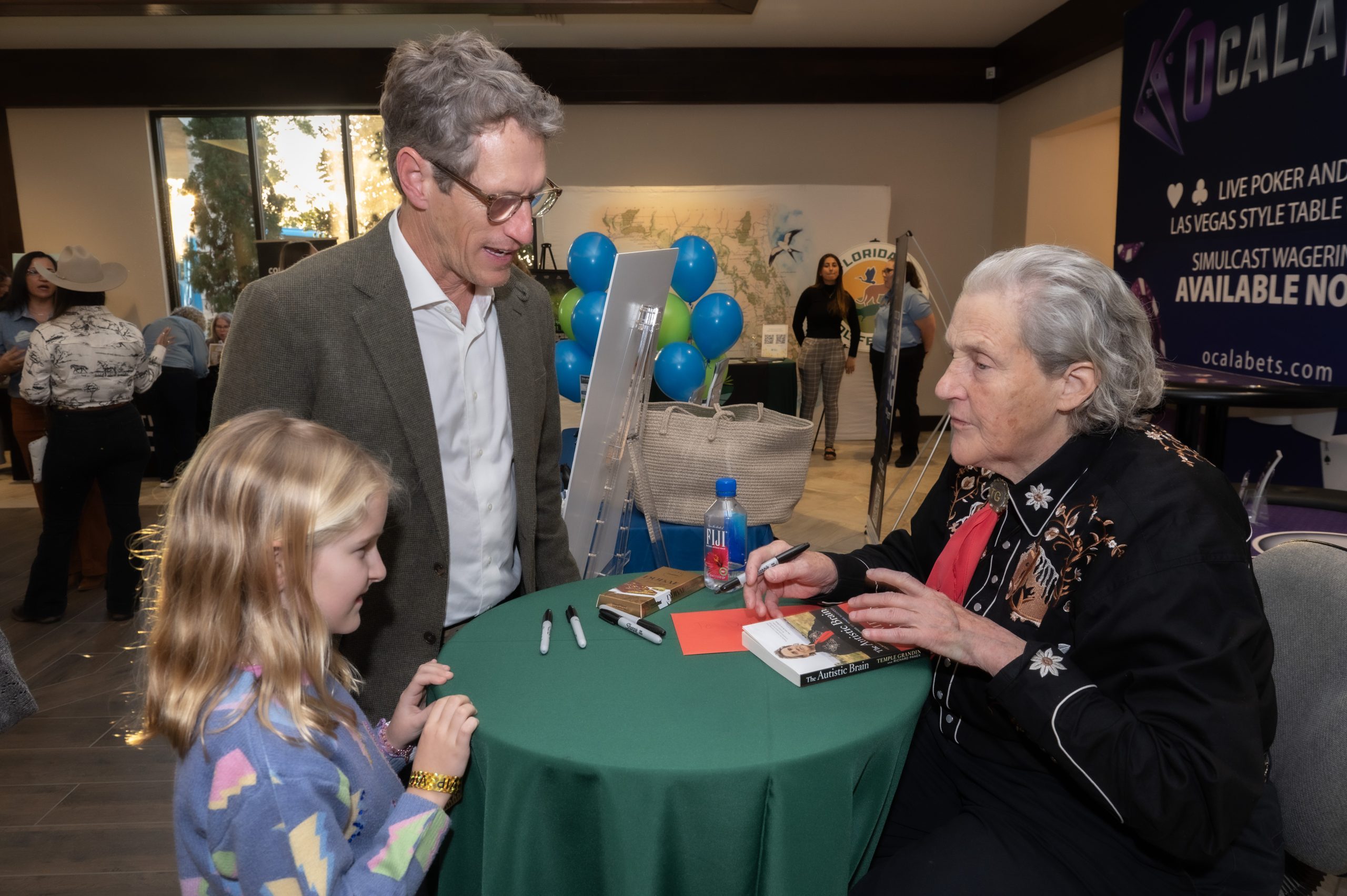 Dr. Temple Grandin signs a book for Nell Ward with her father Carlton Ward, Jr.