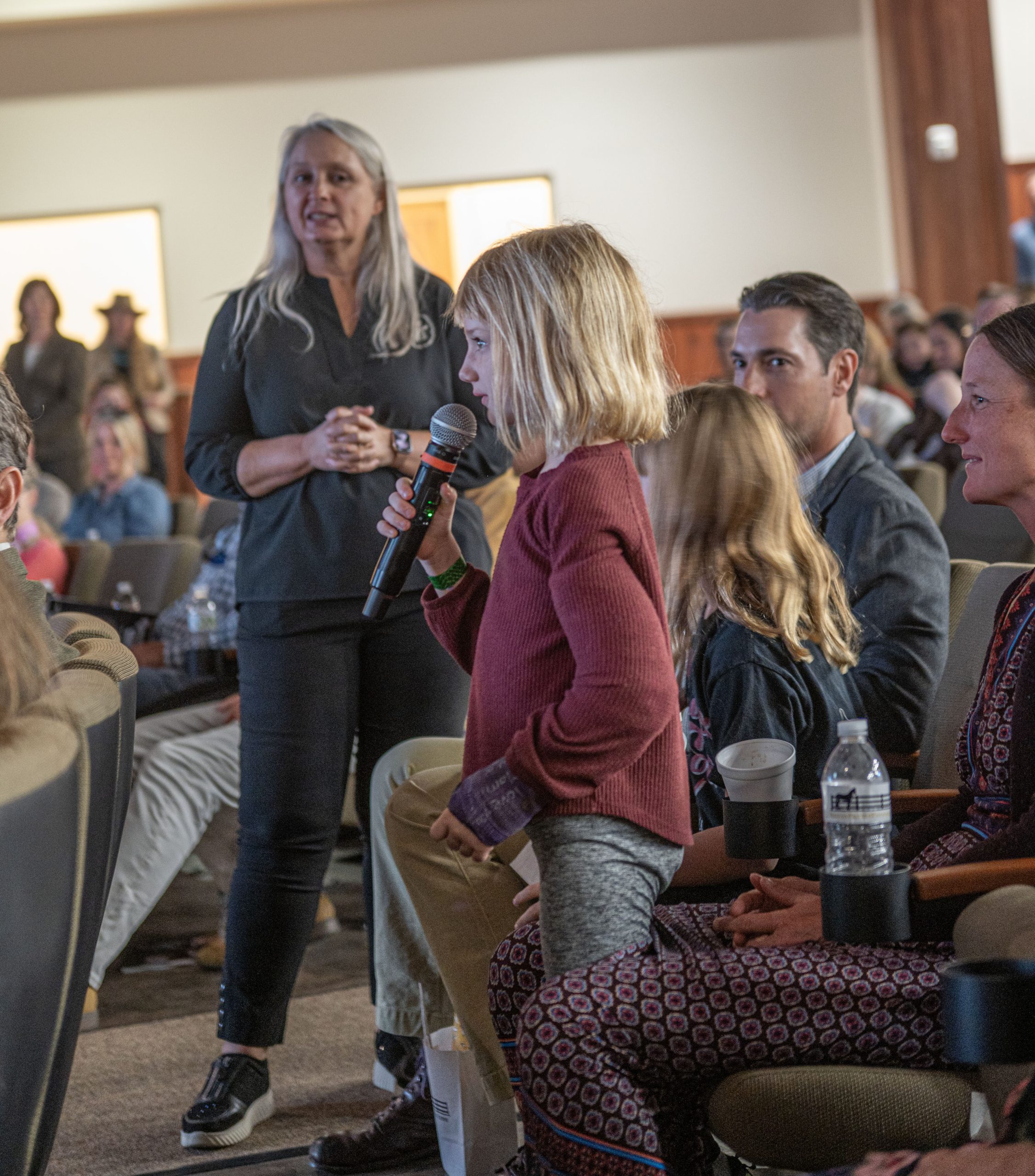 Logan Freeman, a member of the 4-H club – Reddick Collier Elementary Wranglers – asked Dr. Temple Grandin an important question: “How does the squeeze machine calm you and other animals down?”