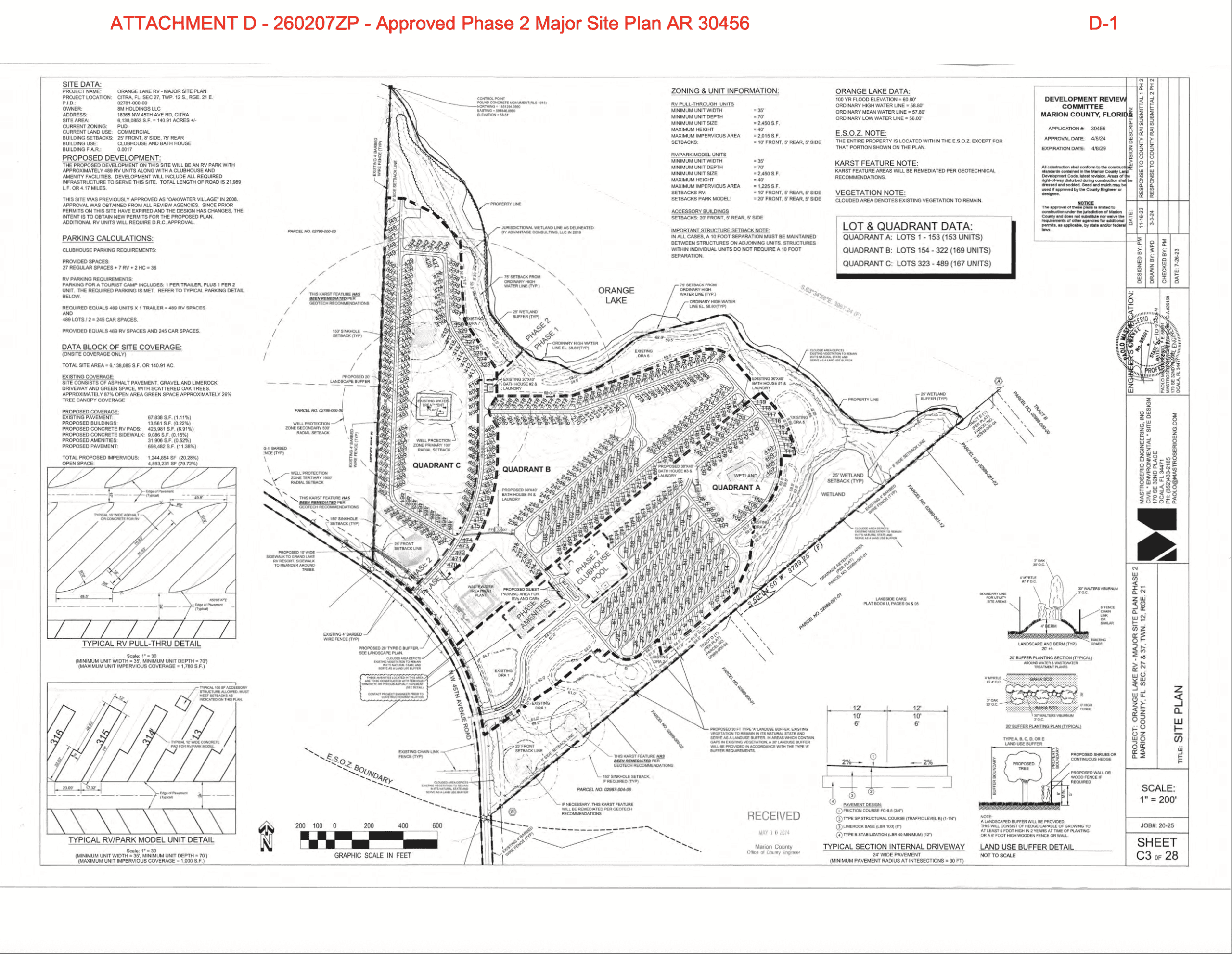 The approved 2024 Site Plan states: “The proposed development on this site will be 489 RV units along with a club house and amenity facilities.” The Building Use is stated as: Clubhouse and Bath House.