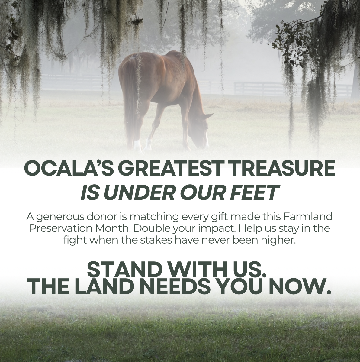Ocala’s identity as the Horse Capital of the World is not an accident. It was built on the unique limestone-rich soil, the open pastures, and the deliberate protection of agricultural land that made world-class horse breeding possible here and nowhere else quite like this. Once that land is converted to subdivisions, truck stops, and commercial strips — it is gone. Not for a generation. Forever.